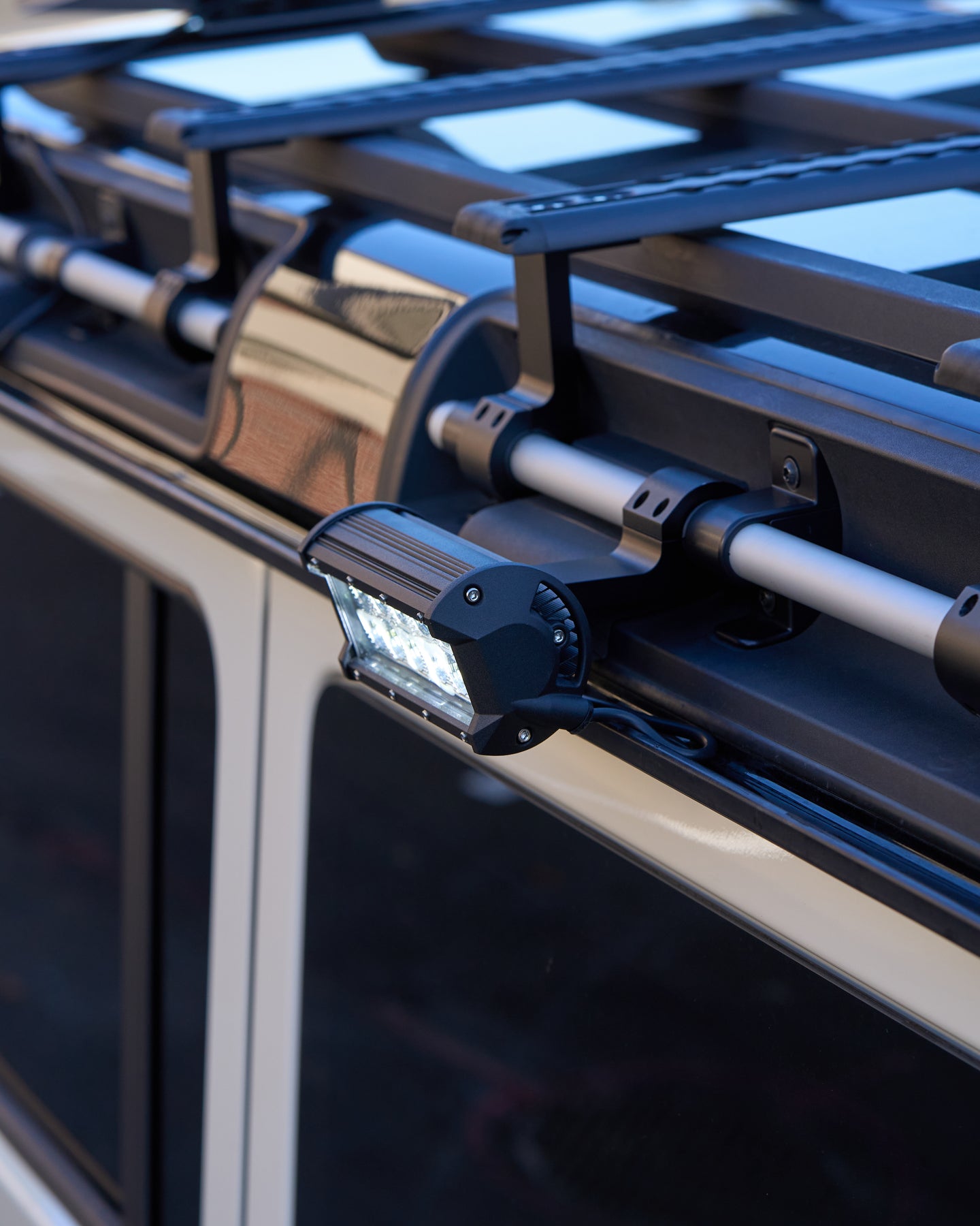 The included mounting system is precision-machined for the INEOS Grenadier’s roof bar. No drilling or modifications required. All brackets, fasteners, and tools needed for installation come in the box.