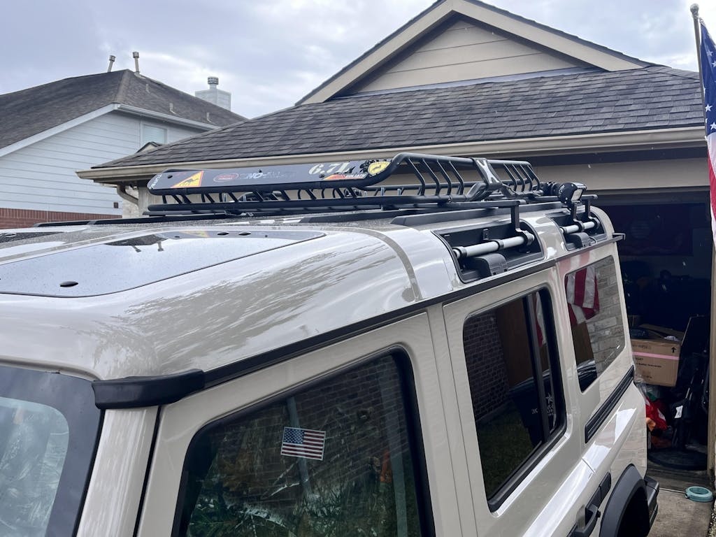 ~1" profile height keeps the Grenadier under a 7' garage door and reduces wind noise and drag at highway speed. Full load capacity with none of the height penalty of traditional roof racks.