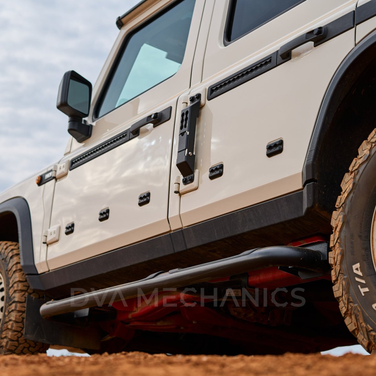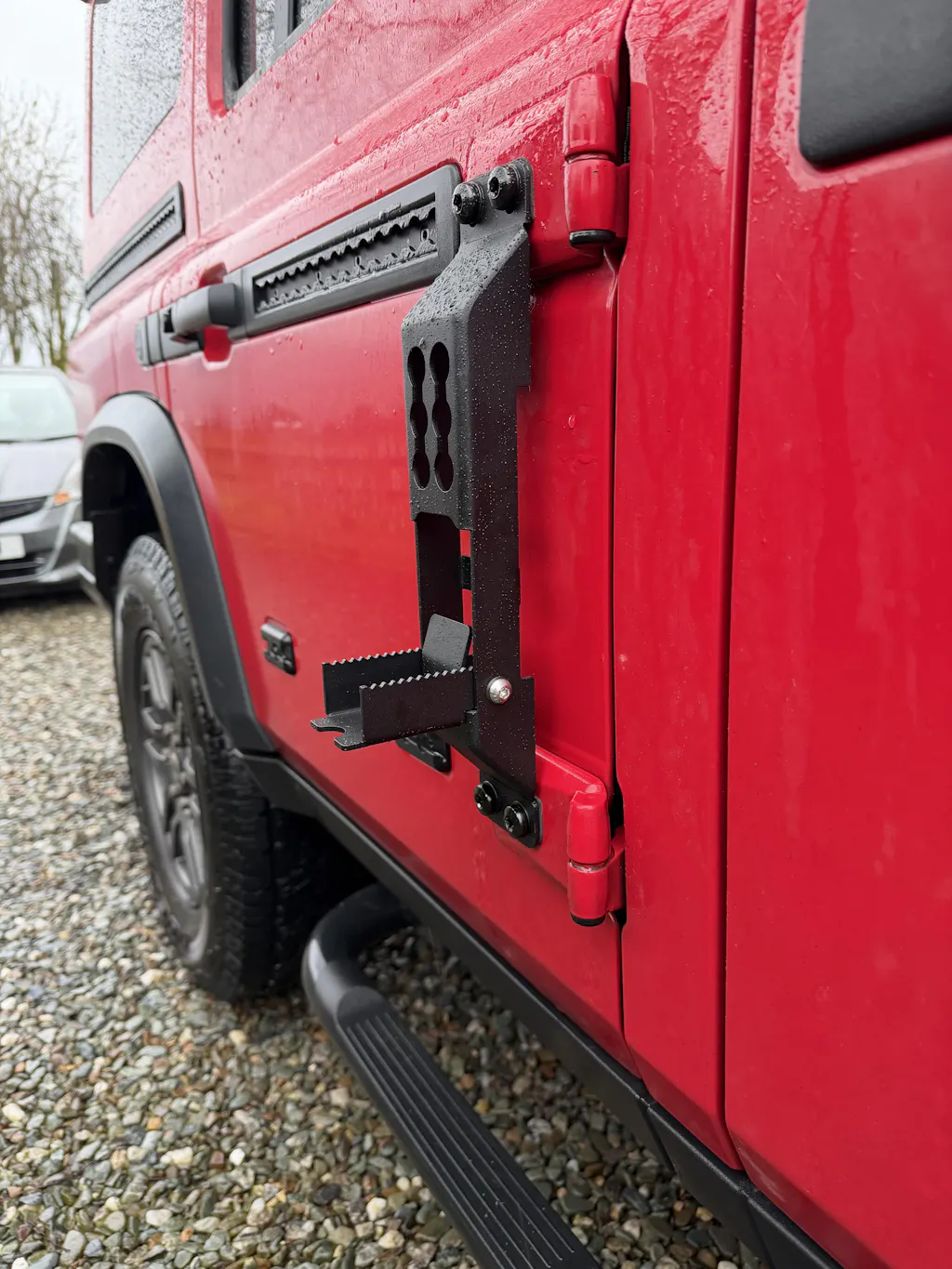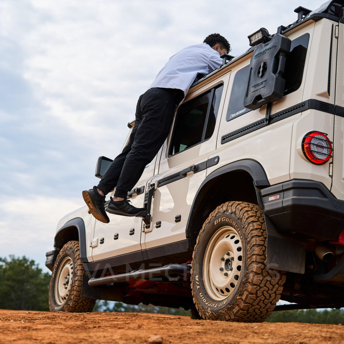 Purpose-built roof access for the Grenadier. The SideStep mounts directly to the rear door hinge bolts — no drilling, no permanent modification. Spring-loaded locking action holds the step secure in both stowed and deployed positions. Cold-rolled steel with matte black powder coat. Aggressive grip teeth for all-weather footing. Works on both Wagon and Quartermaster variants.