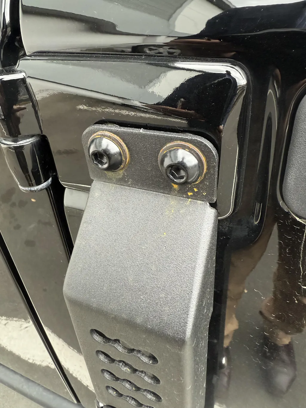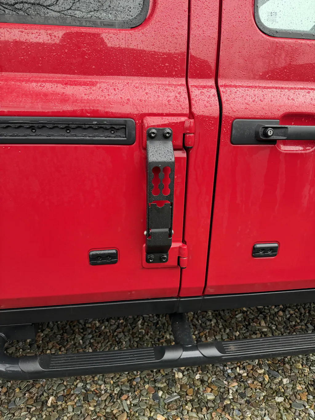 Mounts directly to the rear door hinge bolt pattern — no drilling or modification to the vehicle. Direct bolt-on fitment using the existing hardware interface.